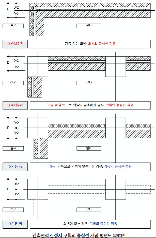 바닥면적과 같이 건축물의 외벽이나 기둥의 중심선을 기준으로 건축면적을 산정한다.